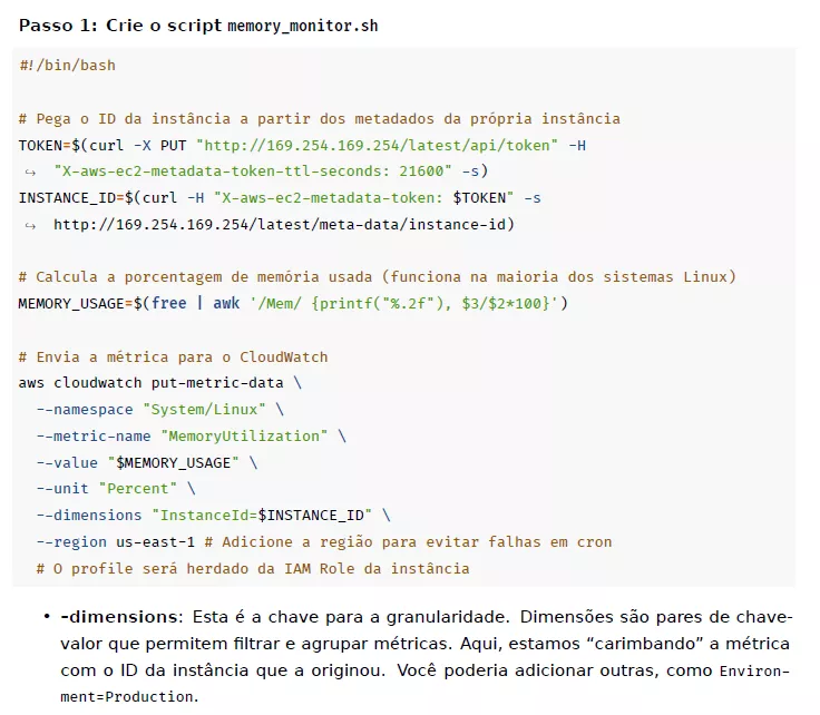 O CloudWatch não monitora memória por padrão? Sem problemas. Nesta amostra, você vê como criamos um monitor de recursos customizado usando Bash e AWS CLI, com as melhores práticas de segurança.